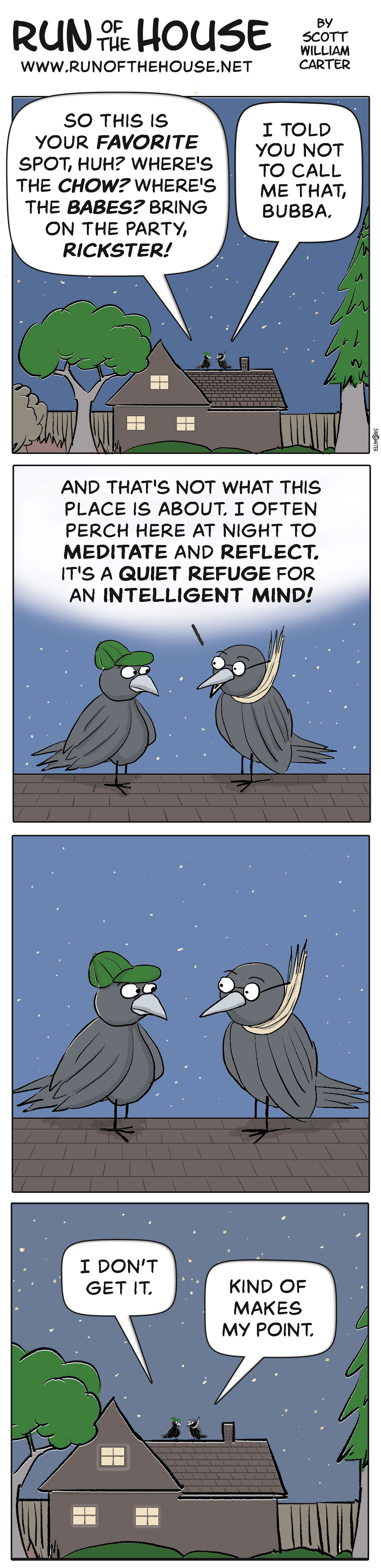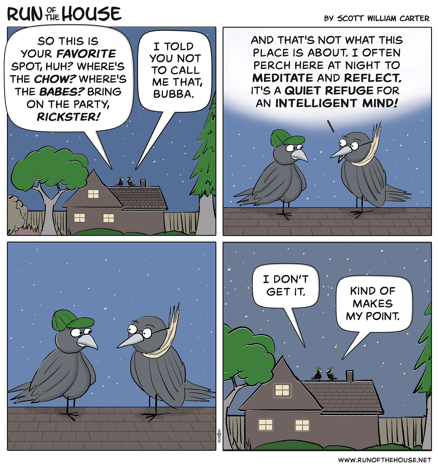 Hi, I’m Scott William Carter, author of cartoons, novels, short stories, and other things. If you’re receiving this by email, you’re either subscribed to the Run of the House cartoon strip, or it was forwarded to you. Previously published comics are available at www.runofthehouse.net.