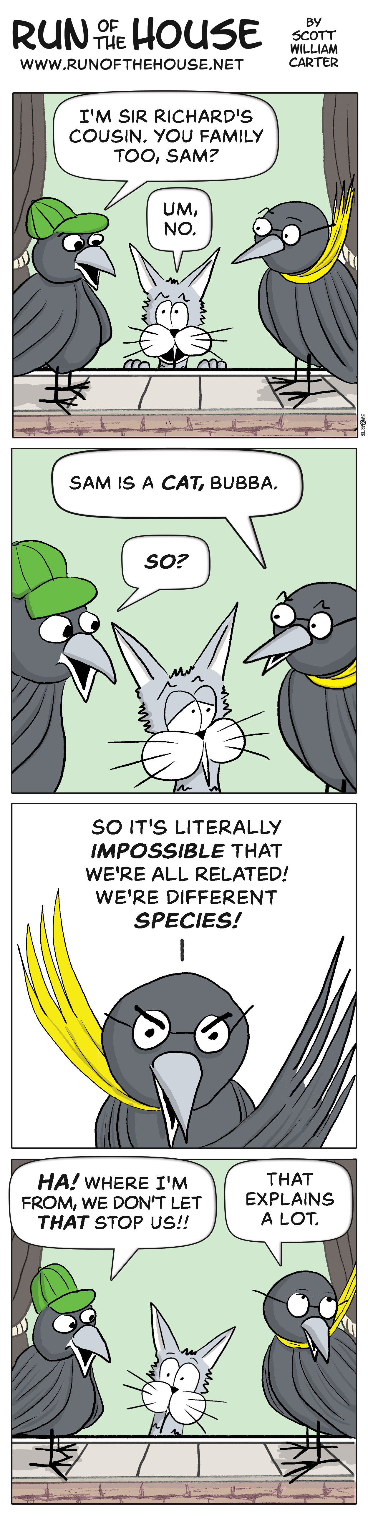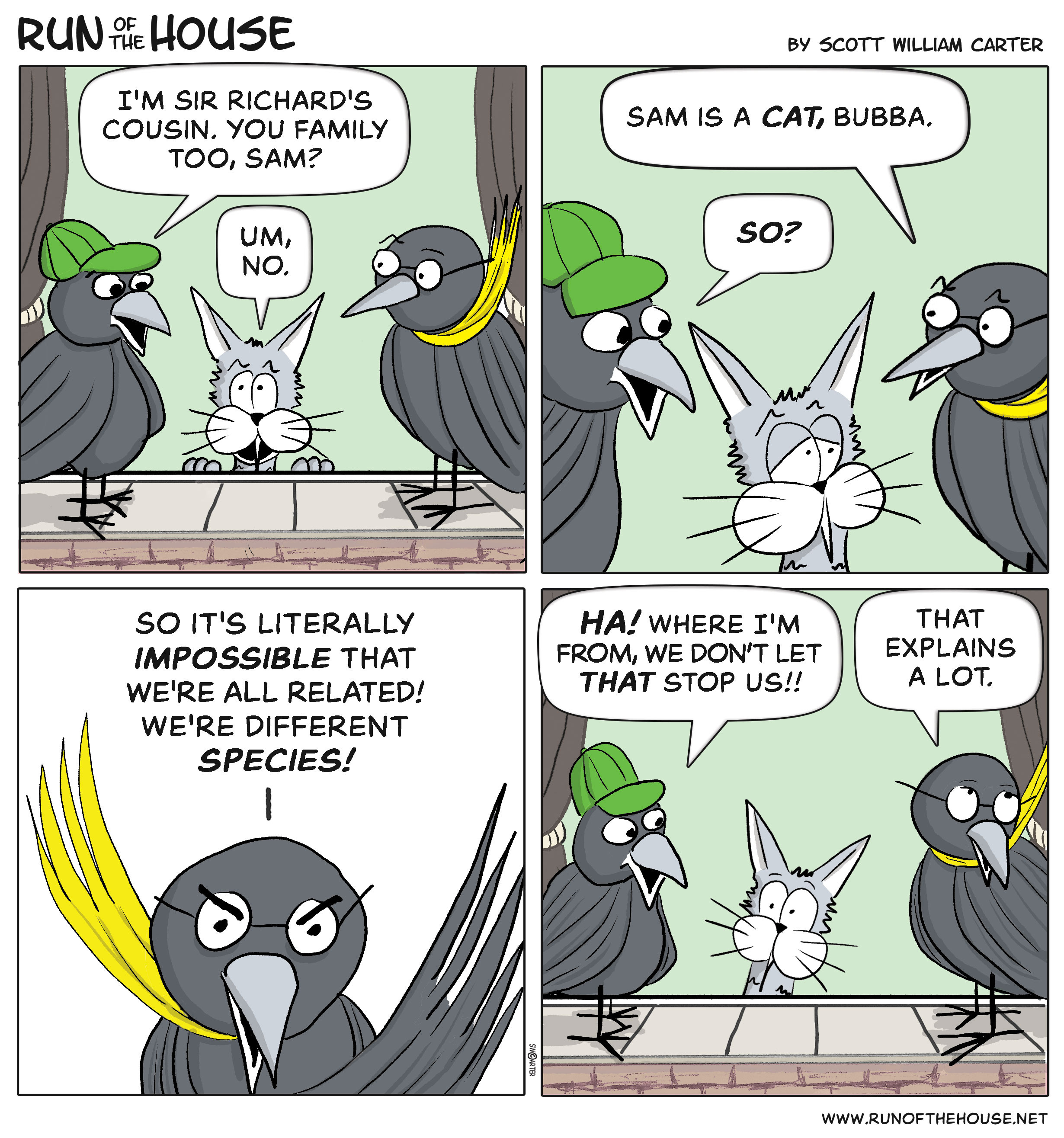 Hi, I’m Scott William Carter, author of cartoons, novels, short stories, and other things. If you’re receiving this by email, you’re either subscribed to the Run of the House cartoon strip, or it was forwarded to you. Previously published comics are available at www.runofthehouse.net.