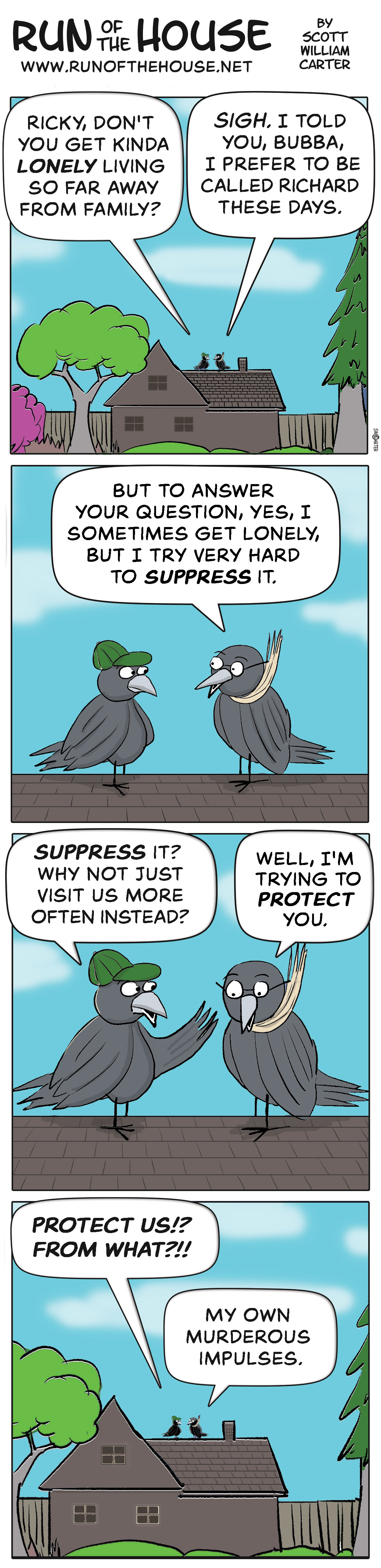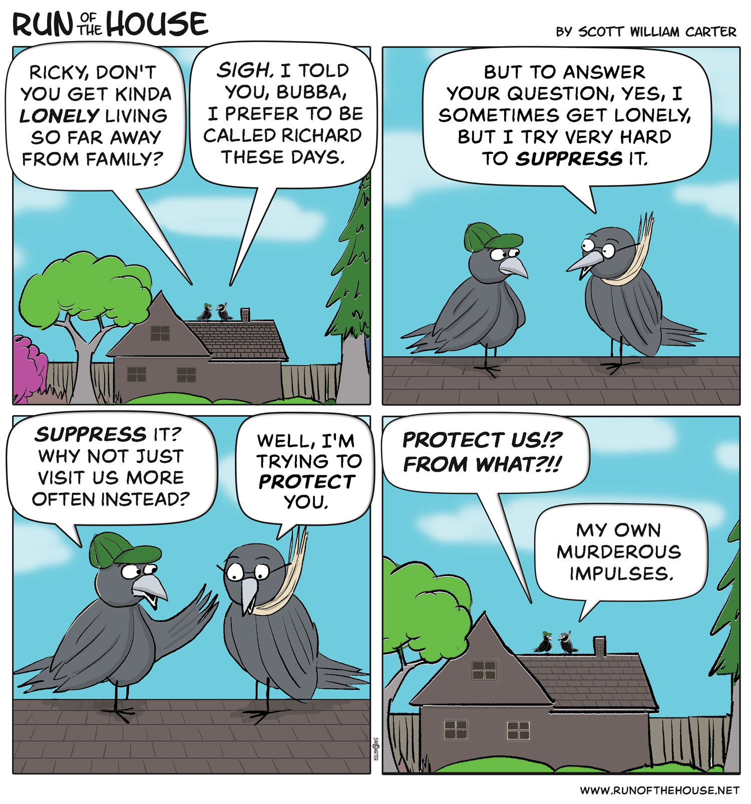 Hi, I’m Scott William Carter, author of cartoons, novels, short stories, and other things. If you’re receiving this by email, you’re either subscribed to the Run of the House cartoon strip, or it was forwarded to you. Previously published comics are available at www.runofthehouse.net.
